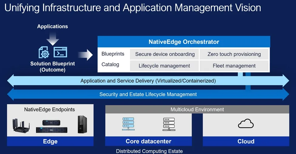 مقدم من خلال استخدام NativeEdge2.0، تنسيقًا سلسًا للتطبيقات عبر أوساط مختلفة. ويمكنك من خلال هذه الميزة، استخدام مخطط Blueprint لنشر التطبيقات الطرفية وإدارتها عبر لنقاط النهاية NativeEdge Endpoints والبنية التحتية الأخرى لأنظمة السحابة المتعددة، سواء من شركة دل أو من غيرها، وذلك من خلال محاكاة افتراضية لمركز البيانات vSphere ونظام Kubernetes. وتقدم تلك الميزة المزيد من المرونة لاختيار أفضل بنية تحتية للتطبيقات الطرفية وتمكنك من تنسيقها بسلاسة مع منصة NativeEdge.