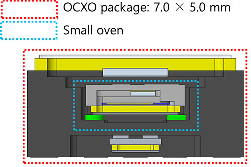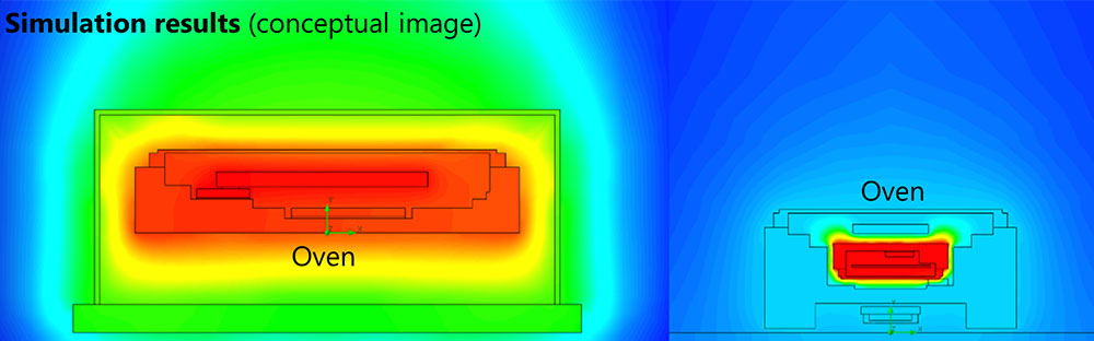 وكان الوصول إلى هيكل فرن منخفض الطاقة من التحديات الأخرى التي واجهت المطورين، ولذلك، فقد قامت إبسون بتطوير وتحسين الدائرة المتكاملة للمذبذب والدائرة المتكاملة للسخان من أجل إبقاء القطع البلورية المعوضة للإجهاد (SC) داخل الفرن عند درجات حرارة ثابتة مع القيام في ذات الوقت بتقليل استهلاك الطاقة الكهربائية. وتم تثبيت الفرن داخل المذبذب البلوري المُدار حرارياً (OCXO) بمادة لاصقة ذات موصلية حرارية منخفضة بهدف تحسين العزل الداخلي، الأمر الذي ساعد في الحد من ضياع الحرارة من الدائرة المتكاملة للسخان والإبقاء على الاستهلاك المنخفض للطاقة الكهربائية. وبفضل استخدام أداة رقمية للتحكم في درجة حرارة القطع البلورية المعوضة للإجهاد (SC) بدلاً من أداة تناظرية تقليدية، فقد تمكن المطورون من الحفاظ على استقرار درجة حرارة القطع البلورية على نحو أفضل حتى عند تقلّب درجات الحرارة المحيطة، الأمر الذي يقلل خصائص التردد/درجة الحرارة للمذبذب البلوري المُدار حرارياً (OCXO) من ±50×10-9 إلى ±3×10-9.