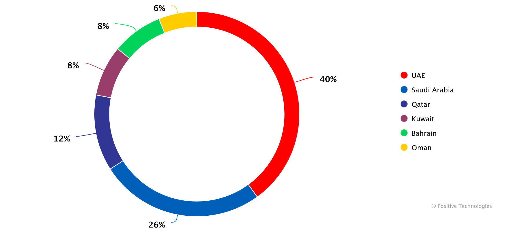 كما أوضحت الدراسة إلى أن مجرمو الإنترنت لا يزالون يركزون على أكبر اقتصادين في المنطقة حيث بلغت حصة الإمارات العربية المتحدة 40% (من جميع المنشورات التي شملتها الدراسة والتي نشرت على الويب المظلم) والمملكة العربية السعودية 26%.