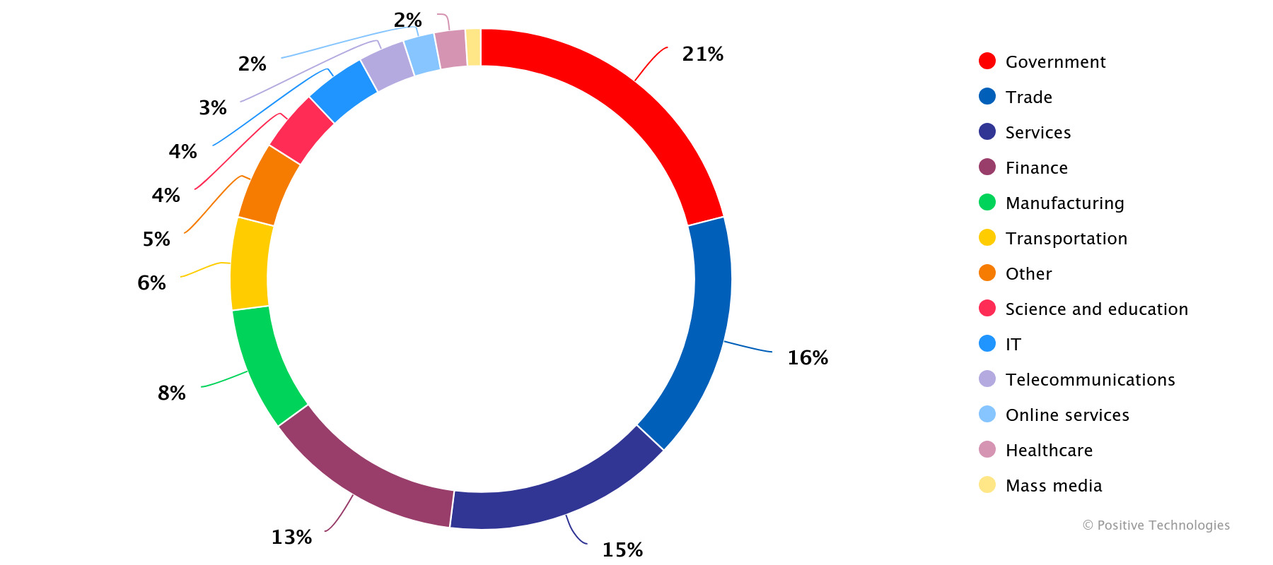 وتشير النتائج إلى أن القطاع العام يعد الهدف الرئيسي للهجمات، حيث استحوذ على 21% من المنشورات. كما تُظهر الدراسة أن 63% من البيانات المتعلقة بالمؤسسات الحكومية نُشرت مجاناً ضمن هجمات نفذها ناشطون سيبرانيون. كما تم استهداف القطاعات التجارية والخدمية والمالية بشكل بارز، حيث استحوذت الإعلانات المتعلقة بها على 16% و15% و13% على التوالي.