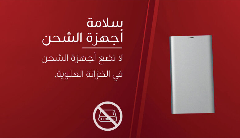 • يُحظر وضع وحدات الشحن المحمولة في الخزائن العلوية داخل المقصورة، ويجب وضعها في جيب المقعد أو في حقيبة تحت المقعد الأمامي.