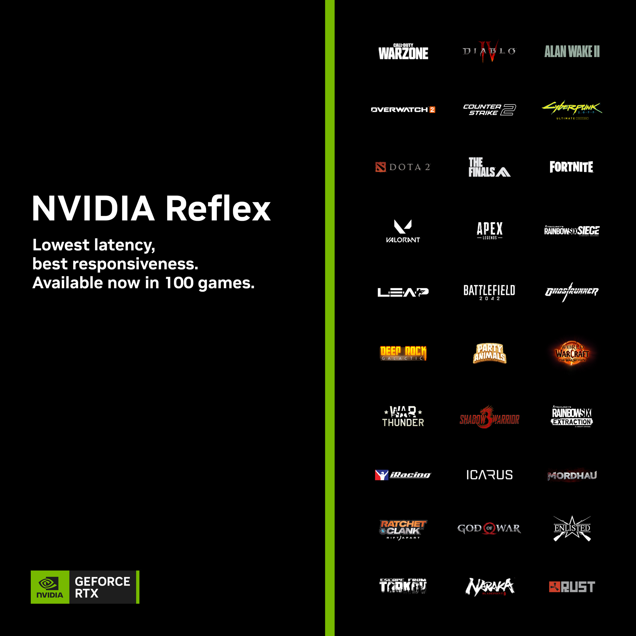 منذ ظهورها لأول مرة في سبتمبر 2020، تم إطلاق أكثر من 100 لعبة مع تقنية NVIDIA Reflex أو إضافة دعم لها. إنها قائمة ألعاب ممتازة حيث تتضمن Apex Legends و Call of Duty: Modern Warfare III و Call of Duty : Warzone و Counter-Strike 2 Fortnite و Overwatch 2 إلى جانب الألعاب الناجحة التي حازت على استحسان النقاد مثل Cyberpunk 2077 و The Witcher 3: Wild Hunt و Diablo IV و Remnant 2 و God of War و Microsoft Flight Simulator و Red Dead Redemption 2 و Ratchet & Clank: Rift Apart و Marvel’s Spider-Man Remastered والمزيد.