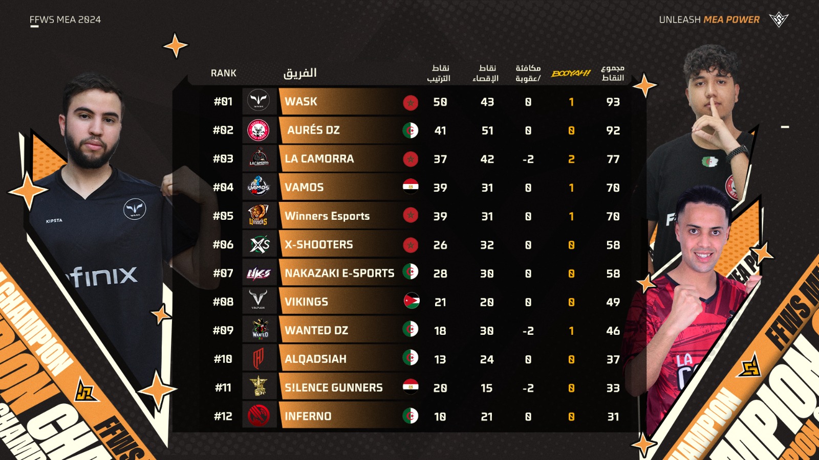 حصد الفريق المغربي “Warriors on Mask” والذي يُعرف بإسم “WASK” لقب بطولة “2024 FFWS MEA” وحجز مقعدًا في نهائيات بطولة فري فاير العالمية “2024 FFWS ” القادمة. وكان من ضمن الفرق المشاركة في البطولة الفريق المصري “Vamos” والذي ظهر بشكل جيد في المنافسات حيث حاز على الاهتمام بحصوله على المركز الرابع في الترتيب العام للبطولة، مما يدل على القوة والإمكانات المتنامية في مجال الرياضات الإلكترونية المصرية.