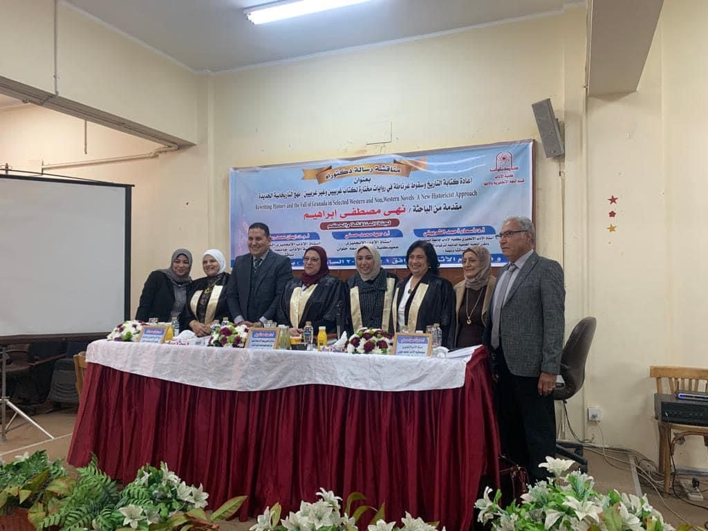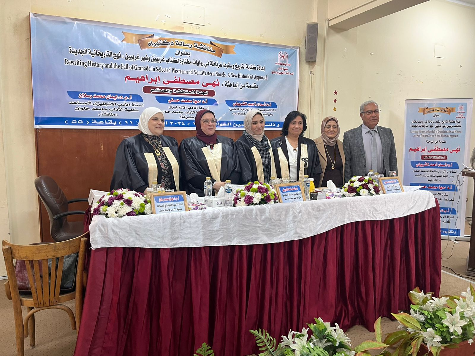 أستعرضت رسالة دكتواره في كلية الآداب جامعة حلوان قسم اللغة الإنجليزية وآدابها قدمتها الباحثة نهى مصطفى إبراهيم، بعنوان “إعادة كتابة التاريخ وسقوط غرناطة فى روايات مختارة لكتاب غربيين وغير غربيين: نهج التاريخانية الجديدة”، وتشكلت لجنة الحكم والمناقشة من: