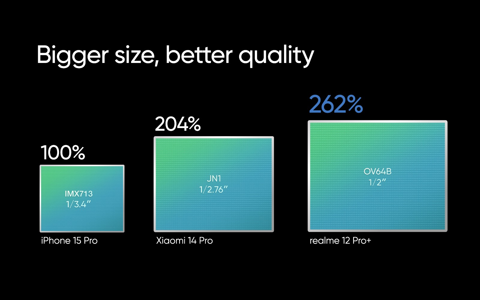 تتميز سلسلة ريلمي 12 برو بأكبر مستشعر لعدسة التصوير البعيد في هذه الفئة، حيث تتميز بمستشعر العلم الرئيسي OV64B، الذي يتفوق على منافسيه ويتماشى مع الهواتف الأخرى الرائدة. بحجم 1/2 بوصة، يكون أكبر من مستشعر عدسة التصوير البعيد في iPhone 15 Pro بأكثر من ضعفين. بفضل فتحة العدسة الأكبر وامتصاص الضوء المُعزز، وتعتبر عدسة التصوير البعيد في سلسلة ريلمي 12 برو أكثر حساسية للضوء بثلاثة مرات من عدسة iPhone 15 Pro.