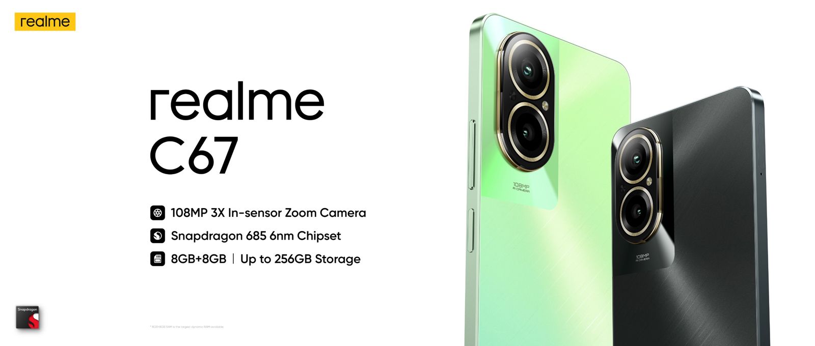 يأتي realme C67 بمواصفات فائقة، من بينها مجموعة شرائح Snapdragon 685 بتقنية 6 نانومتر، وسعة تخزين تصل إلى 256 جيجابايت، وكاميرا تكبير 3x بدقة 108 ميجابكسل، وشحن سريع SUPERVOOC بقوة 33 واط، هذا بجانب تميزه بمظهر عصري وفريد مستوحى من Sunny Oasis. الذي تعد الإضافة الجديدة لسلسلة ريلمي C على وشك أن تحدث ثورة في صناعة الهواتف الذكية بفضل ميزاتها الاستثنائية Top of Form.