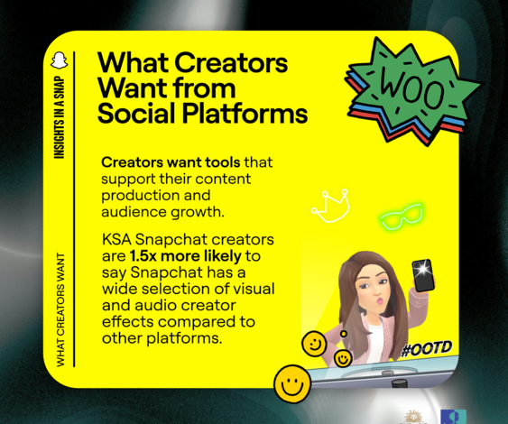 • ما يريده صناع المحتوى من منصات التواصل الاجتماعي: يظهر 94% من صناع المحتوى في سناب شات تقارب كبير مع المنصة، مقارنةً بنسبة 76% تجاه المنصات الأخرى، ويشعرون براحة أكبر بنحو 1.4 مرة في مشاركة حياتهم اليومية، حيث يعتبرون سناب شات مساحةً آمنة لمشاركة اللحظات الحقيقة الصادقة.