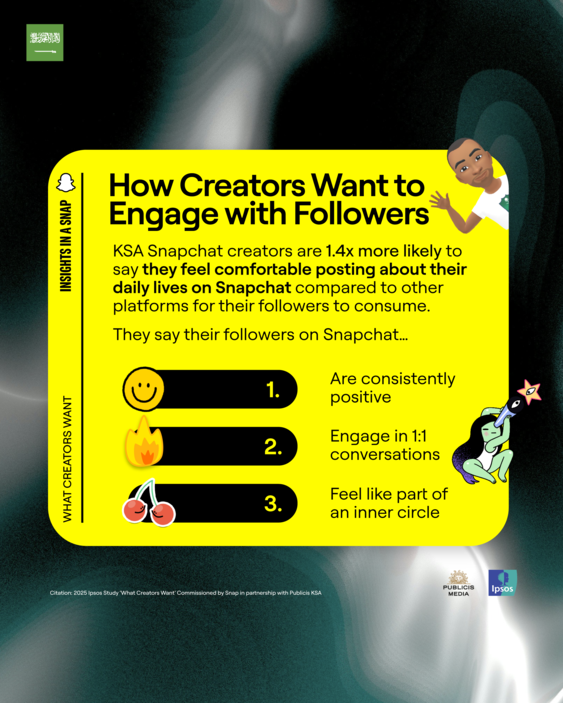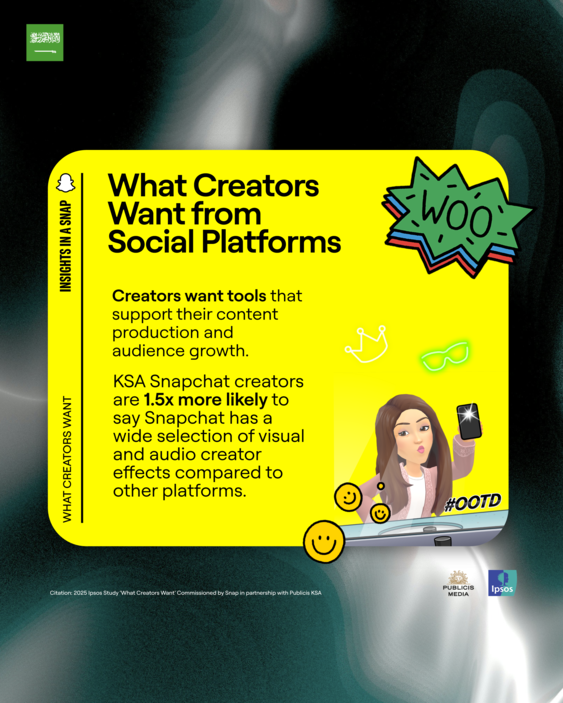 عقدت سناب شات، بالتعاون مع شركتي بوبليسيس ميديا الشرق الأوسط وإبسوس، دراسةً جديدة في المملكة العربية السعودية لفهم ما يريده صناع المحتوى من منصات التواصل الاجتماعي والعلامات التجارية ومتابعيهم. وتناولت الدراسة طريقة تعامل صناع المحتوى مع مختلف المنصات التي ينشرون عليها، والأدوات التي يستخدمونها، وما يطلبونه من شراكات العلامات التجارية، وكيف ينظرون إلى جمهورهم.