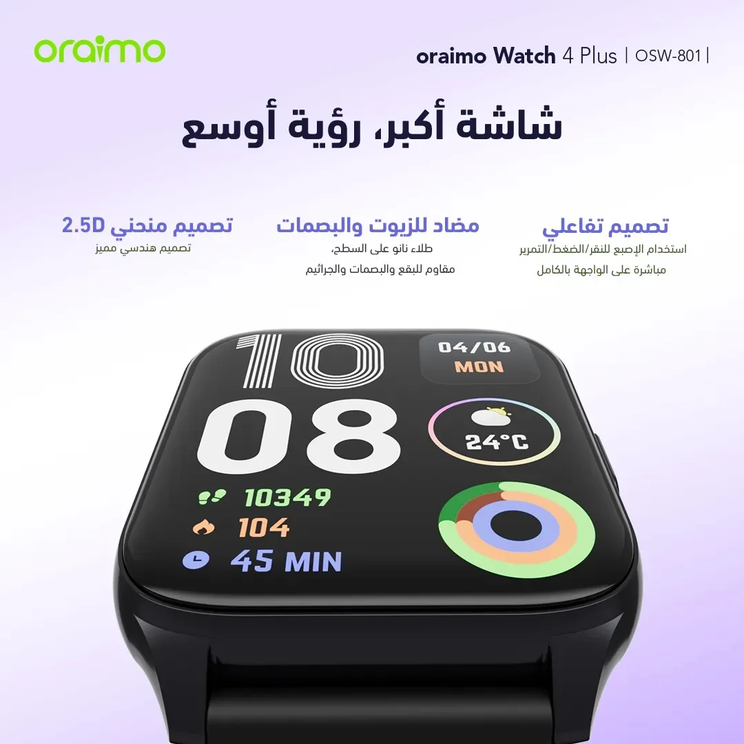 وقد تم تصميم Oraimo Watch 4 Plus بأناقة لمساعدتك على البقاء على اتصال وبصحة جيدة في حياتك اليومية، حيث تعد الساعة الذكية المثالية للأفراد المهووسين بالتكنولوجيا الذين يبحثون عن الأسلوب والأداء.