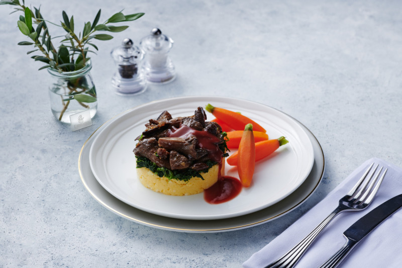 - الدرجة السياحية الممتازة: يتوفر للعملاء خيارات نباتية، مثل الكاري مع الأرز البسمتي، أو يخنة الكستناء والقرع تليها كعكة الجزر الخفيفة والرقيقة مع كريمة جوز الهند وقشر البرتقال المسكر، أو موس الشوكولاتة الناعمة مع كومبوت الكرز.