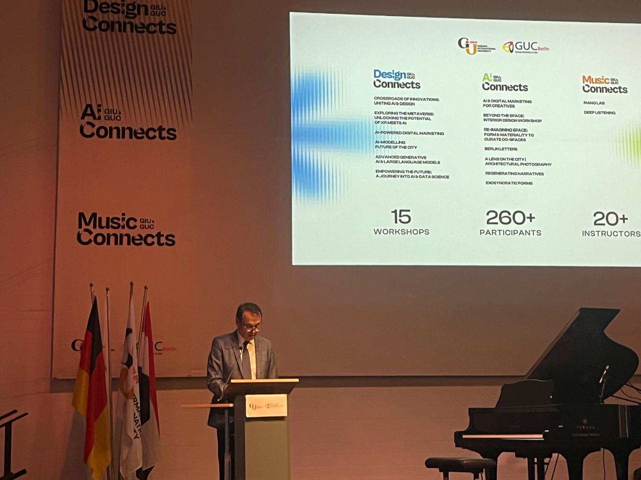 خلال كلمته التى ألقاها المستشار أحمد الأنصاري نيابة عن خالد جلال سفير مصر لدى ألمانيا، إن احتفالية “التواصل بالموسيقى” المنعقدة بحرم الجامعة الألمانية في برلين، وورش العمل كانت ملتقى للتصميم والذكاء الاصطناعي والموسيقى، وكل هذه الأنشطة تمهد الطريق إلى المستقبل الباهر، موجهاً الشكر لكل المشاركين في المجالات المختلفة وهيئة التبادل العلمي الألمانية ووزارة التعليم والبحث العلمي الفيدرالية والدكتور أشرف منصور الذي قدم الكثير للتعليم العالي.