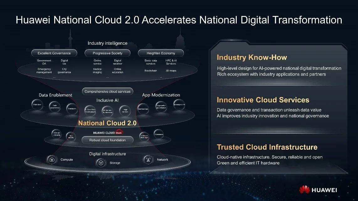 وقد جاء إطلاق هواوي للسحابة الوطنية National Cloud 2.0 لدعم الحكومات في رحلتها نحو التحول الرقمي، وتعتمد السحابة الوطنية National Cloud 2.0 على خبرة هواوي في قيادة مساعي عملائها وشركائها حول العالم نحو التحول الرقمي، حيث توفر بنية تحتية سحابية موثوقة، وخدمات سحابية مبتكرة، مما يساعد الحكومات على تحقيق رؤاها الرقمية الوطنية بشكل أسرع: