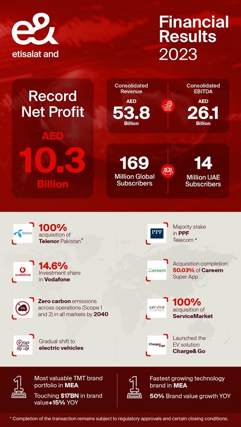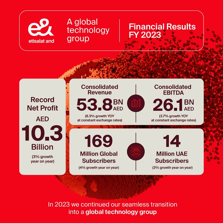 أعلنت «&e»، المجموعة الرائدة في مجال التكنولوجيا، اليوم عن نتائجها المالية الموحدة للعام 2023، حيث سجلت صافي أرباح موحدة تاريخية بقيمة 10.3 مليار درهم، بنمو سنوي نسبته 3 بالمئة.