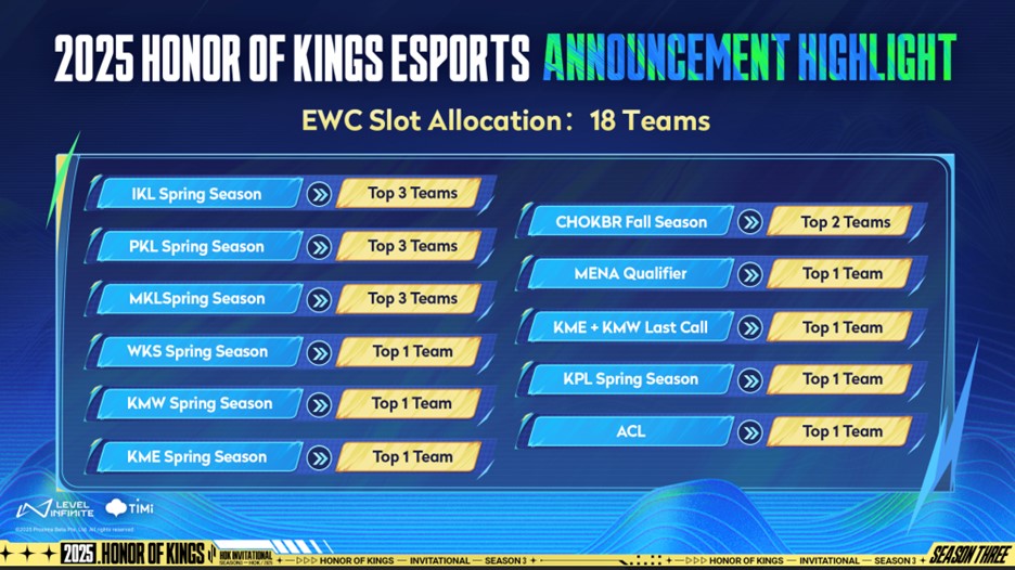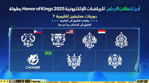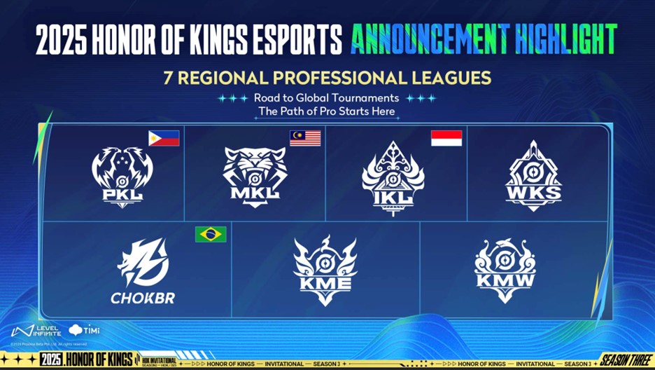 وتضمن الإعلان تفاصيل عن البطولات الدورية الاحترافية الإقليمية؛ حيث ستضاف إلى المنظومة ستّ بطولات إقليمية جديدة وهي: PKL وMKL وIKL وWKS وKME وKMW – إلى بطولة KPL (دوري المحترفين King Pro، Honor of Kings Professional في الصين) وبطولة CHOKBR (بطولة Honor of Kings Brazil في البرازيل). وستساهم هذه البتطولات الاحترافية المضافة حديثًا في إثراء منظومة الرياضات الإلكترونية العالمية الحالية، وتوسعة نطاق وصولها لتشمل المزيد من المناطق في العالم.